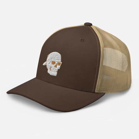 SKELLIES Brown Trucker Hat - Skull with Sunglasses Embroidery, Breathable Mesh, Adjustable Snapback, Unisex Urban Cap